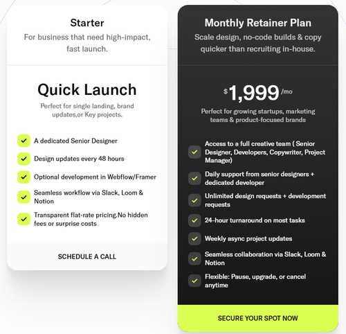 Quick Launch: Need just one thing done? This is perfect. You pay once, we do the work, and you're done. Great for single projects like 'I need a new website' or 'I need a logo.